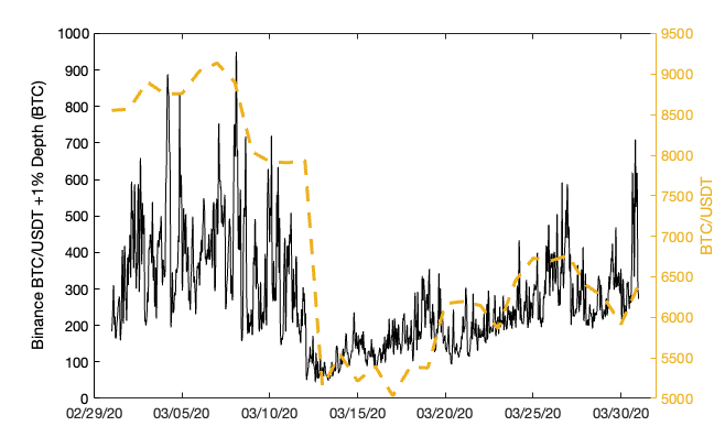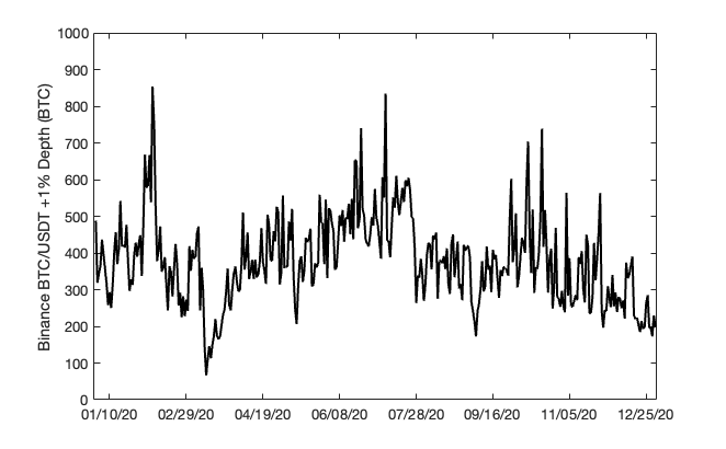 An important consideration for the viability of this framework is the variability of global liquidity over time and if it is amenable to periodic updates via SCCP. To illustrate, we examine BTC/USDT liquidity on Binance for all of 2020 (most liquid trading pair on the most liquid exchange, shown below). Here, we see that liquidity (when measured in base units rather than quote units) generally does not tend to evolve too rapidly over time. Note that the data shown below has undergone substantial smoothing. However, while order book depth is extremely erratic on short time frames, exploiting relatively small variabilities between liquidity offered on Synthetix and what is globally available in spot markets is an extremely risky and expensive exploit vector.