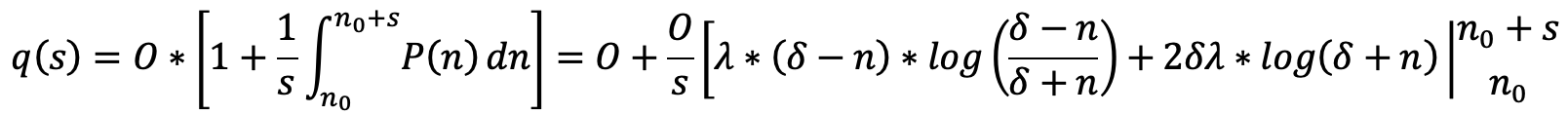Accordingly, the price \(q(s)\) quoted for an order of size \(s\) is the average value of the price function over the course of the order's execution relative to the oracle price: