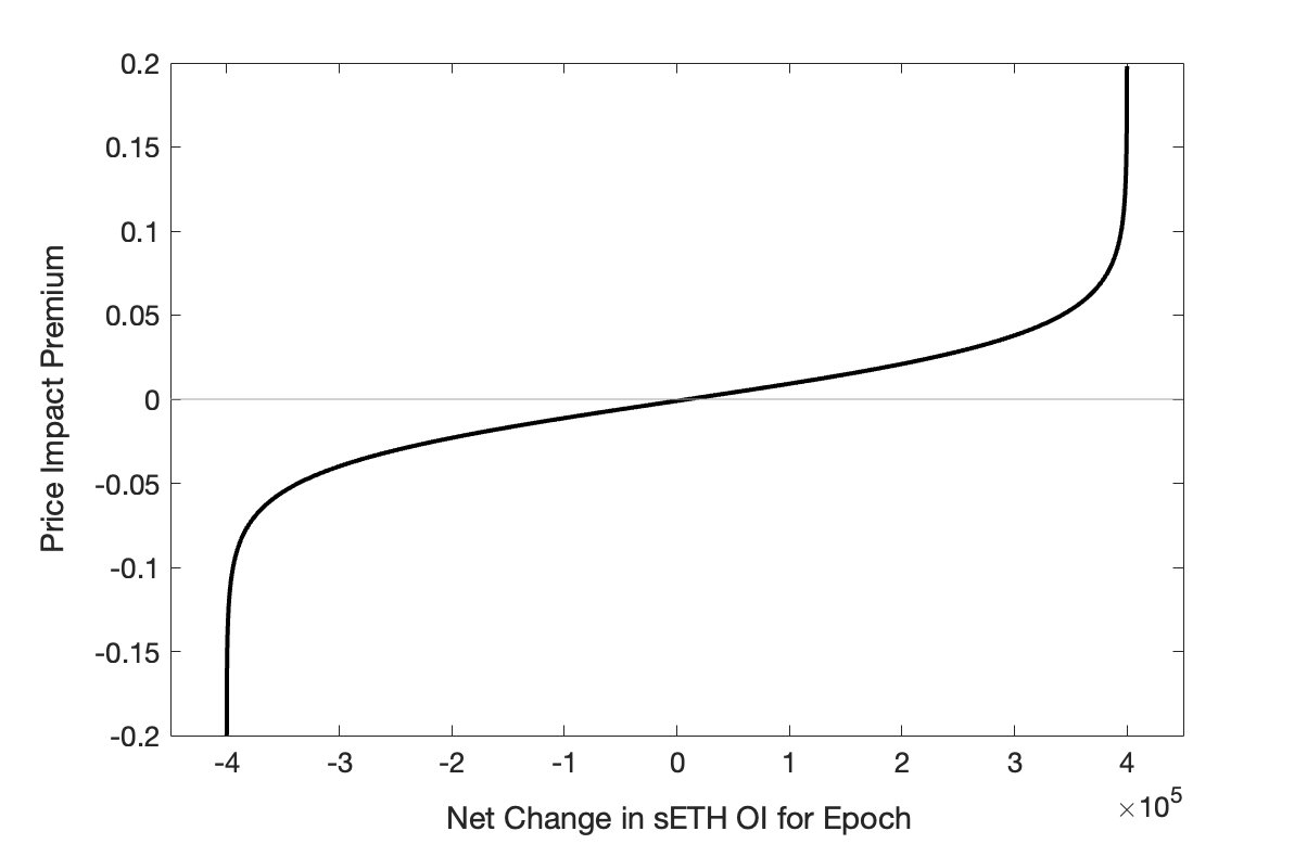 where \(n\) is the net change in open interest during a given epoch, \(\delta\) is the maximum allowable change in open interest per epoch, and \(\lambda\) is a liquidity constant that corresponds to the price impact quoted for an order of size \(\frac{e - 1}{e + 1}\delta\).